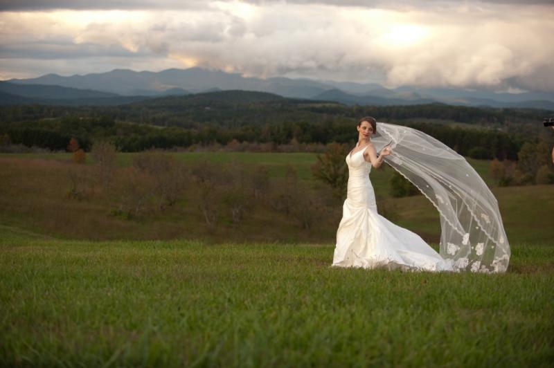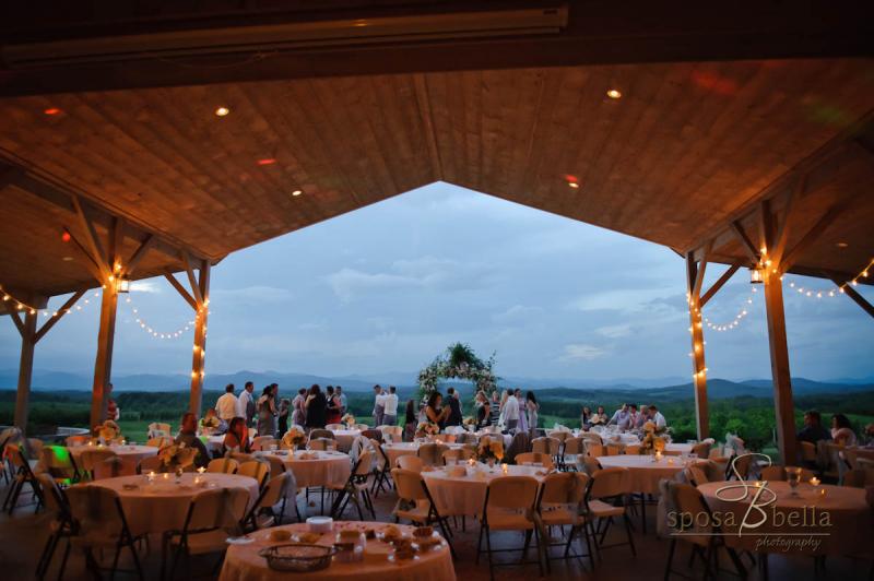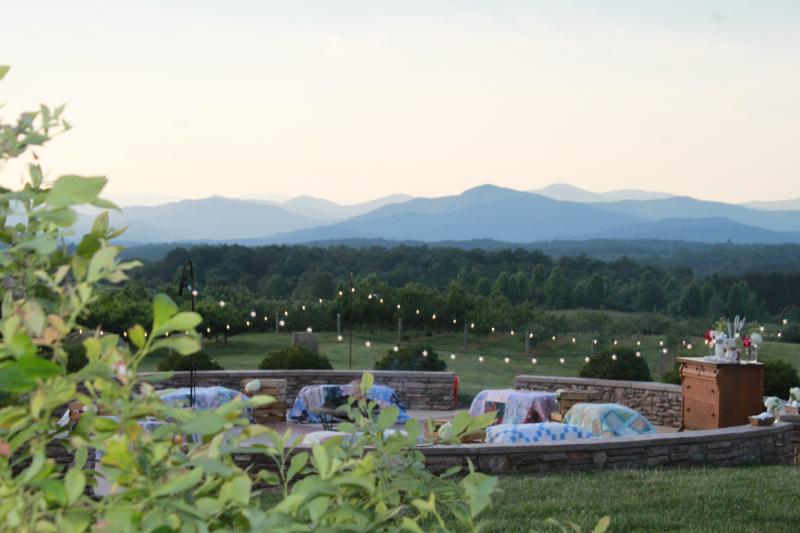 The event barn is the perfect place for your wedding or special occasion. The large stacked stone fireplace welcomes you and adds to the rustic charm of the barn. The back of the barn opens with large sliding doors onto a covered patio that frames the 270 degree view of the Blue Ridge Mountains. The barn also features a catering kitchen, restrooms, and lawn space for tents.